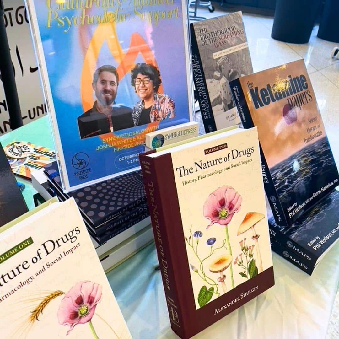A good handful of attendees had also been present at PS23 and immediately recognized Synergetic Press as the team that had been running the bookstore there–a gratifying recognition! Other new friends were wide-eyed as they browsed our selection of titles for sale. Many had heard of Sasha and Ann Shulgin’s classics PIHKAL and TIHKAL but were excited to thumb through them for the first time. The glorious Donna Torres illustrations on the covers of both volumes of Sasha’s The Nature of Drugs were instant conversation-starters. Chacruna Institute’s essay collections Queering Psychedelics and Psychedelic Justice seemed tailor-made for keeping the trenchant discussions on best practices around the use of psychedelic medicine going. And copies of Saga Briggs’s How to Change Your Body sold out almost instantly–her warm and approachable writing style serving as a welcoming open door for getting us all to consider how we can take effective next steps into more holistic ways of healing.